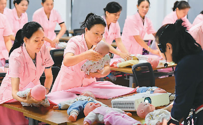 近年来,海南省儋州市打造“儋州月嫂”劳务品牌,解决大量农村中青年妇女的劳动就业问题。从2018年4月至今,该项目已帮助3000余人实现就业。图为7月21日,在儋州市的海南西部家庭服务中心,学员在老师指导下练习婴儿包单。新华社记者 杨冠宇摄