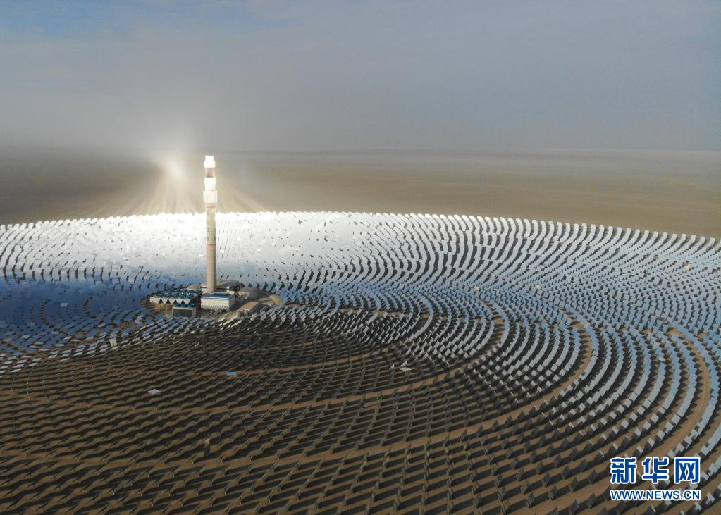 在甘肃省敦煌市向西约20公里处,被称为“超级镜子发电站”的首航高科敦煌100兆瓦熔盐塔式光热电站在戈壁滩上闪耀(2021年2月24日摄,无人机照片)。
