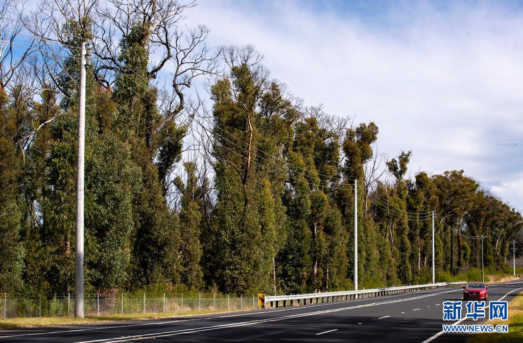 6月1日,在澳大利亚悉尼以西的蓝山地区,公路旁遭受2020年夏天山火灾害的林地部分植物已经恢复繁茂。